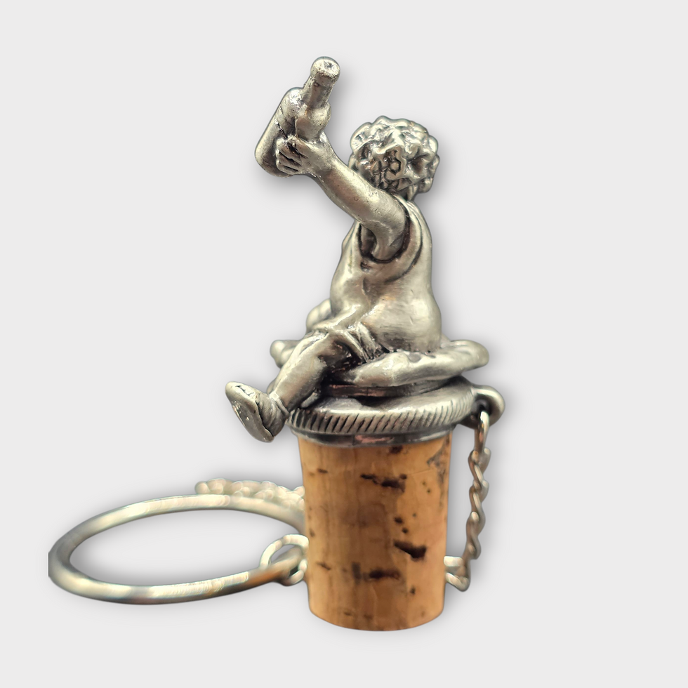 Vintage Pewter Cherub Bottle Stopper with Cork & Chain – Neoclassical Style