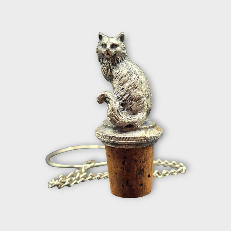 Vintage Pewter Cat Bottle Stopper with Cork & Chain – Mid-Century Barware